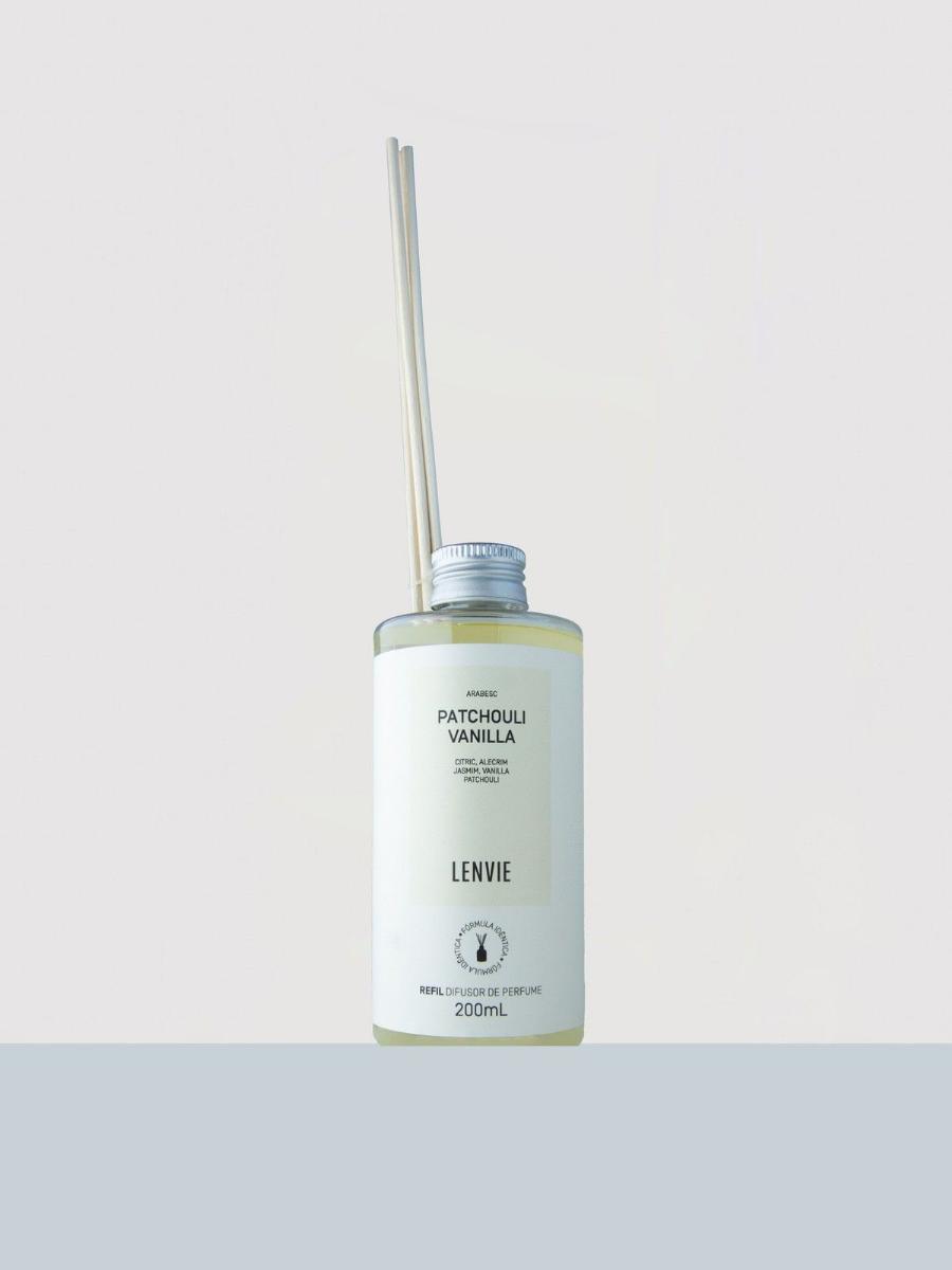 O Refil Difusor de Perfume Patchouli Vanilla 200ml, ideal para a reposição do líquido no frasco do difusor, sendo uma opção prática e sustentável.